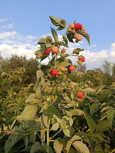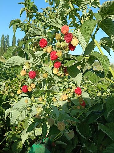 - Крупноплодная красная малина с высокой урожайностью: на ветках формируется множество кистей, одновременно завязываются ягоды разной степени спелости.
