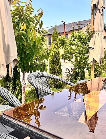 - Просторная летняя терраса с плетёной уличной мебелью, столами со стеклянными столешницами и большими зонтами.