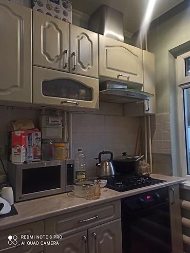 - Кухня отдельная: навесные и напольные шкафы, вытяжка, варочная панель на газу, духовой шкаф, микроволновка, чайник.