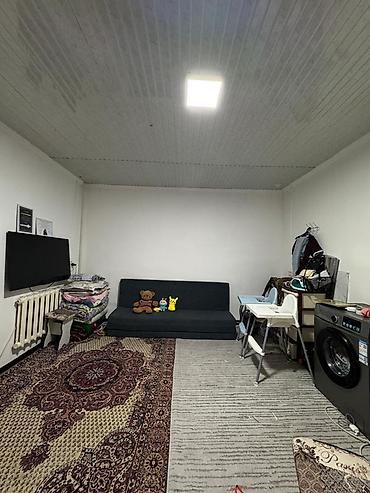 - Жилая зона с раскладным диваном, настенным телевизором, радиаторным отоплением и потолочным LED-светильником.