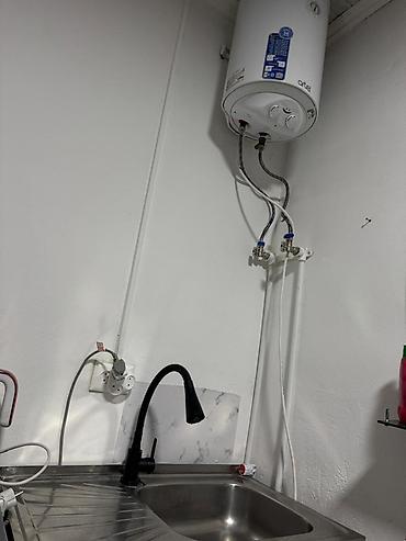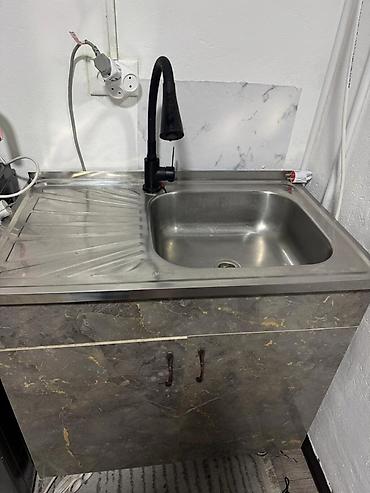 - Кухонный уголок: мойка, смеситель, настенный электрический водонагреватель Artel (обеспечивает горячую воду), розетки рядом для техники, столешница.