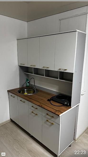 - Мини‑кухня: гарнитур с верхними и нижними шкафами, открытые ниши, круглая мойка, смеситель, столешница под дерево; электроплитка на 1 конфорку.