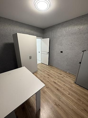 - Комната: светлая, с потолочным светильником, ламинированным полом; установлен шкаф-купе/распашной шкаф, стол, отдельный холодильник.