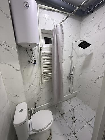- Санузел: совмещённый, полностью в плитке; душевая зона с трапом и шторкой, унитаз, водонагреватель (бойлер), полотенцесушитель.