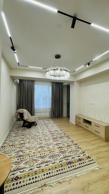 Светлая 1‑комнатная квартира с качественным современным ремонтом и удобной планировкой. В районе нижний Джал - Просторная гостиная с большим угловым диваном, стильной люстрой и настенным кондицио...