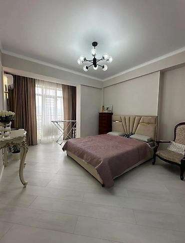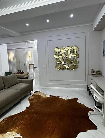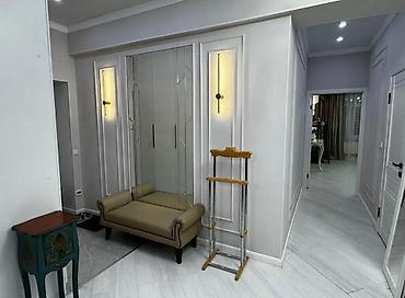 Сдается просторная квартира с современным ремонтом. Прихожая оборудована большим зеркальным шкафом-купе, удобной банкеткой и напольной вешалкой для одежды. Ванная комната оснащена душевой кабиной с черным профилем, подвесным унитазом, раковиной и стиральной машиной. Гостиная комната включает в себя большой угловой диван, декоративный ковер из шкуры, настенное панно и телевизор. В квартире выполнена качественная отделка в светлых тонах с
