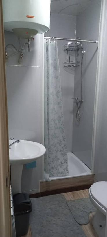 - Санузел совмещенный: душевая кабина со шторкой, умывальник, унитаз, водонагреватель, полочки и коврики.