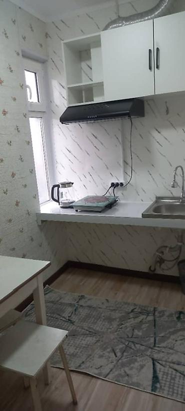 - Кухонная зона: настенный шкаф, вытяжка, столешница, мойка, электрическая конфорка, электрический чайник, обеденный стол со стулом.