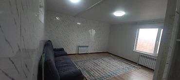 - Просторная жилая комната с большим окном, радиаторами отопления, диваном и ковром, потолочное освещение.