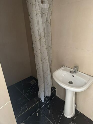 - Санузел раздельный: унитаз, умывальник на пьедестале, душевая зона с порожком и шторкой, трап в полу для слива.