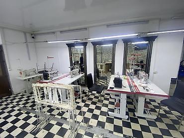 Швейный цех под запущенное производство - Производственное помещение с установленным оборудованием для швейного дела. - Ряд промышленных швейных машин на индивидуальных столах с лампами и катушкам...