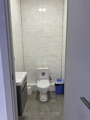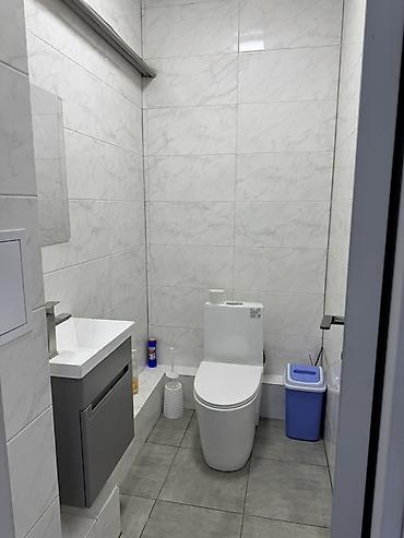 - Санузел внутри помещения: унитаз, раковина с тумбой, плитка на стенах и полу.