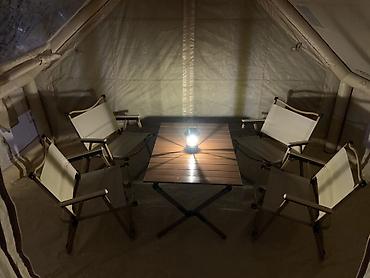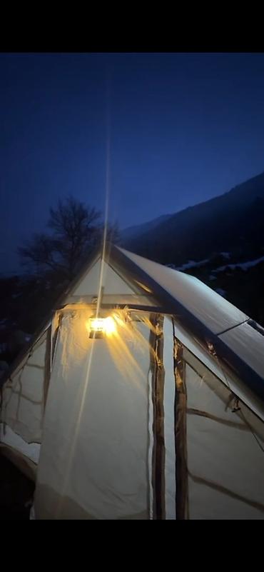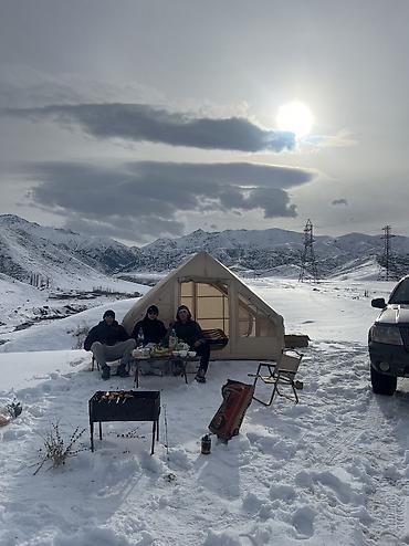 - Плотный влагостойкий тент светло‑бежевого цвета, пригоден для зимних выездов на снегу и межсезонья.