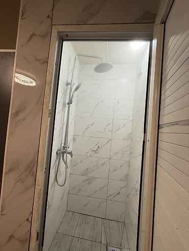 - Санузел/душевой блок в помещении: душевая кабина с верхним и ручным душем, стены и пол выложены керамической плиткой.