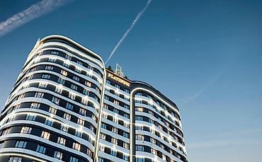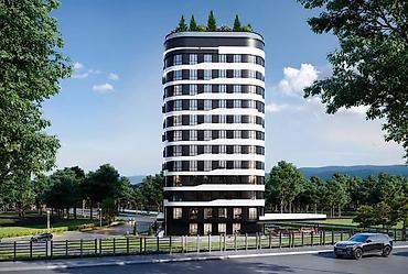 - Современный 12-этажный дом с выразительной архитектурой: плавные фасадные линии, панорамное остекление, акцентная подсветка по периметру.
