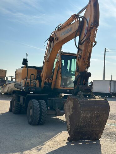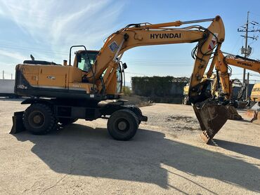 - Колёсный экскаватор Hyundai R180W — манёвренная техника на пневмоколёсном ходу для работы в городе и на подготовленных площадках. Оснащён объёмным ковшом с зубьями, гидролиниями на рабочее оборудование и отвальным ножом-отвалом для планировки. Подходит для: