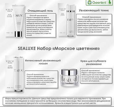 SEALUXE- уходовый набор для кожи лица , подходит для всех типов кожи . Специально разработанная формула с морскими водорослями , гиалуроновой кислотой, растительными экстрактами , которые поддерживают упругость кожи увлажняя и восстанавливая ее.