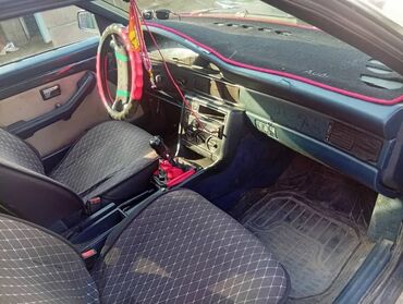 Audi 100 седан, черный цвет, на киргизских номерах. Основные особенности: - Кузов седан, 4 двери. - Передняя оптика прямоугольная, фирменная решетка с эмблемой Audi. - Салон темный, тканевый, уста...
