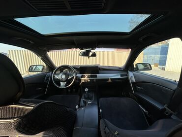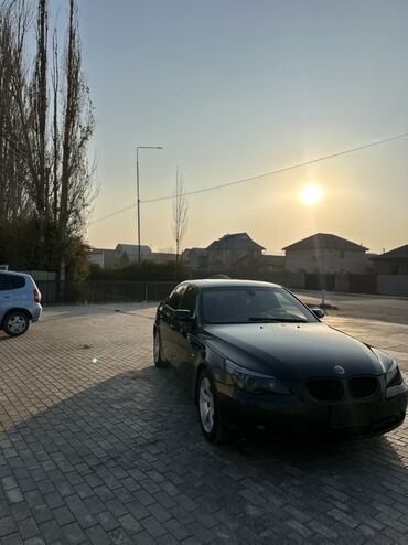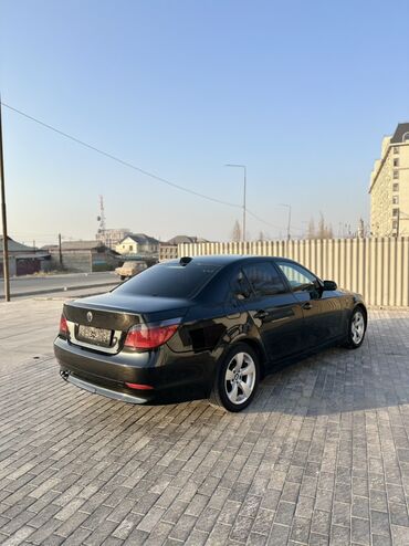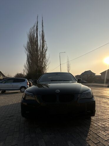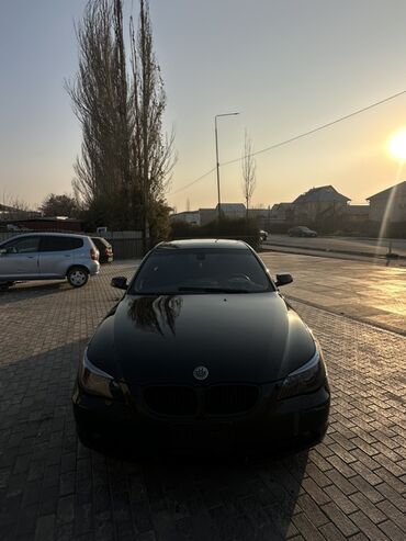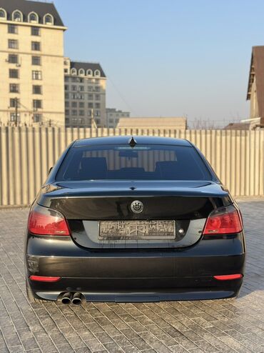 BMW 5 Series (E60) седан, черный цвет кузова. Классический бизнес-дизайн, оригинальные задние фонари и двойной выхлоп слева. Заводские 5‑спицевые легкосплавные диски, тонированные стекла, «акулий плавник» на крыше.