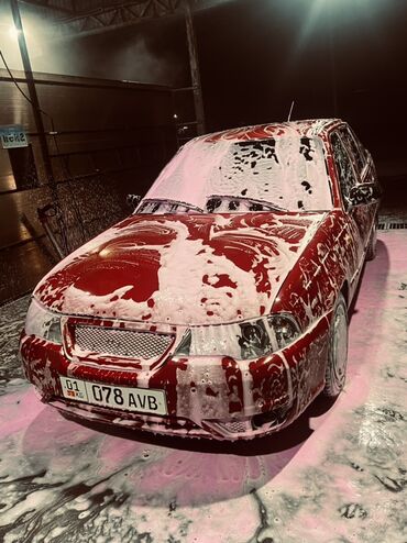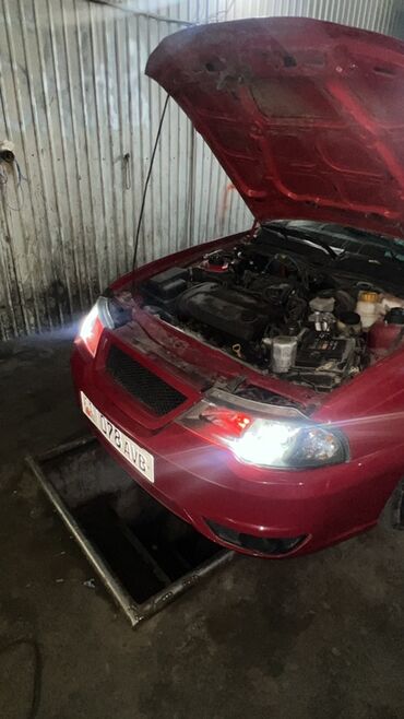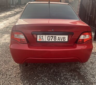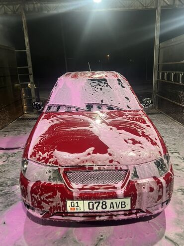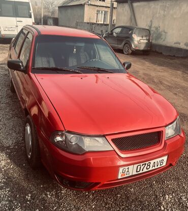 Седан Daewoo Nexia (рестайлинг). Ярко‑красный цвет кузова, 4 двери, номерные рамки KG.