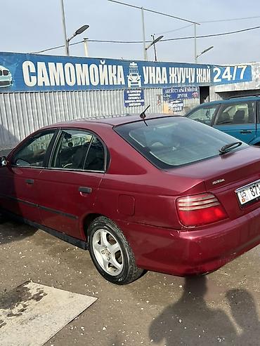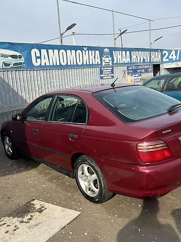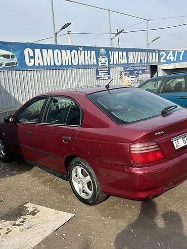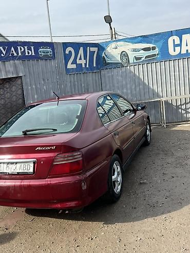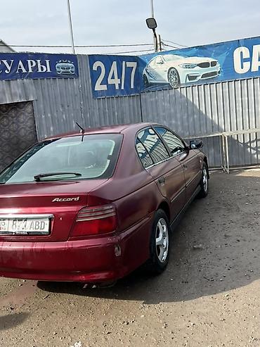 Honda Accord седан, бордовый цвет, 4 двери, правый руль. Кузов поколения 90‑х/начала 2000‑х, заводские шильдики Accord и Honda. Литые 15" диски на шинах дорожного типа. Полноразмерный багажник, выхлоп сзади слева, антенна на крыше, задние фонари секционные. Боковые молдинги по периметру, дверные ручки в цвет кузова, зеркала с электроприводом. Салон тканевый, передние сиденья с подголовниками, задний диван с подголовниками, 5 мест. Передний и задний бамперы окрашенные, задний — с выемкой под номер. Топливная горловина справа. Подвеска дорожного клиренса, привод передний. Комплектация включает: