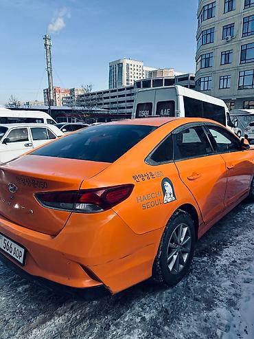 Hyundai Sonata, оранжевый седан (корпоративная окраска/оклейка HAECHI SEOUL). Номера KG 04, госзнак 566 AOP.