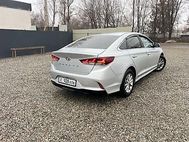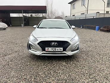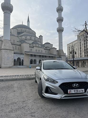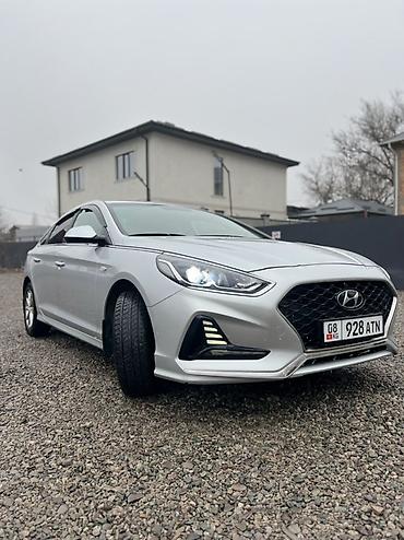 Сатылат сатылат Hyundai Sonata, серебристый седан последнего дорестайлинга с фирменной каскадной решеткой радиатора.