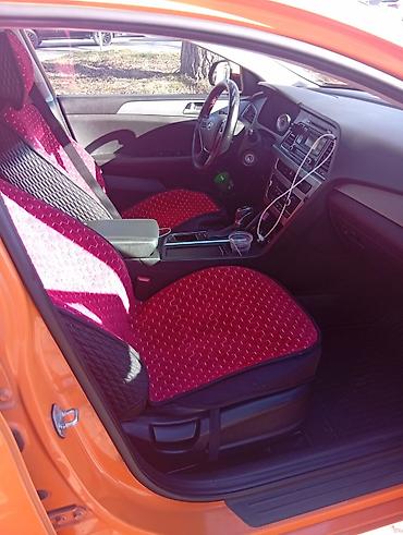 Hyundai Sonata, белый седан, рестайлинг. Просторный салон с яркими чехлами из эко-кожи и велюра (оранжево‑черный, стеганый рисунок), отдельные накладки на подголовники. Передняя панель закрыта мягк...