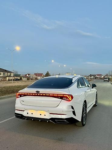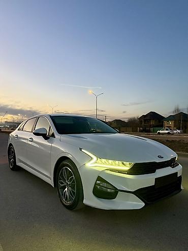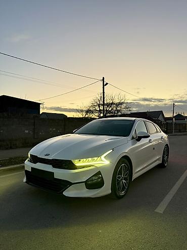 Kia K5, белый седан бизнес‑класса с динамичным дизайном.