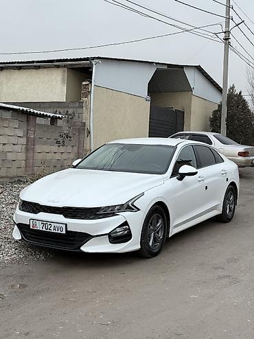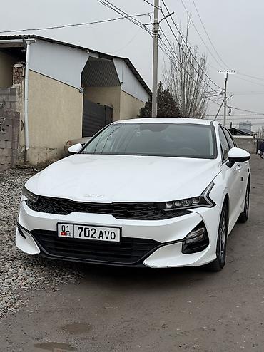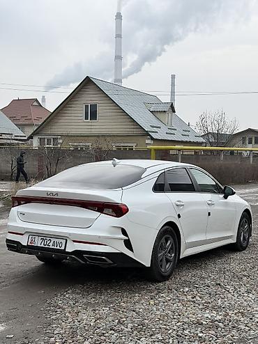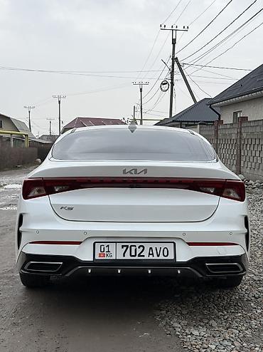 Номера KG на автомобиле. Цвет — белый, кузов седан Kia K5 нового поколения с актуальным логотипом. Отличный выбор для ежедневных поездок и дальних маршрутов благодаря сочетанию дизайна, технологий и эффективности.