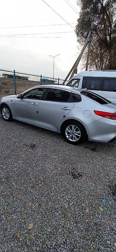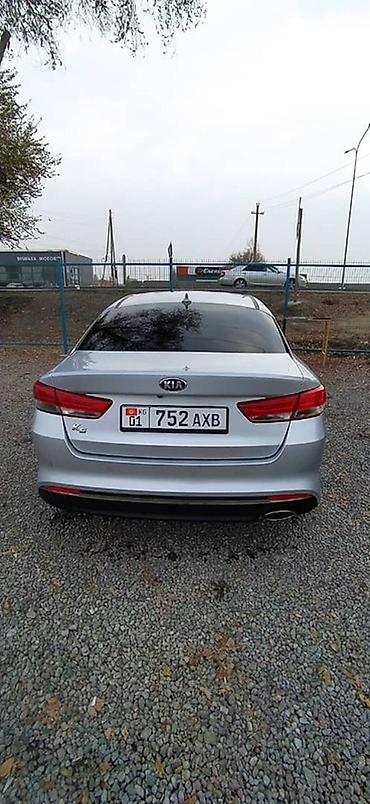 Kia K5 (Optima) серебристого цвета, кузов седан. Современный дизайн с фирменной решеткой и узкими фарами, аккуратные задние фонари, хромированные элементы по контуру окон. Легкосплавные диски, тонированные стекла, акулий плавник на крыше, двойной выхлоп. Компактные парктроники/датчики по бамперам, боковые повторители поворота на крыльях. Номерные знаки KG.