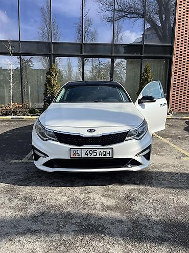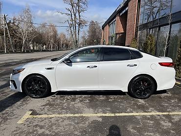 Kia Optima, белый седан. Стильный и динамичный экстерьер: черная крыша и зеркала, тонированные стекла, черные легкосплавные диски, красные тормозные суппорты, спортивный обвес бампера, патрубок выхлопной системы. Акуратная оптика и светодиодные элементы, задние парктроники.