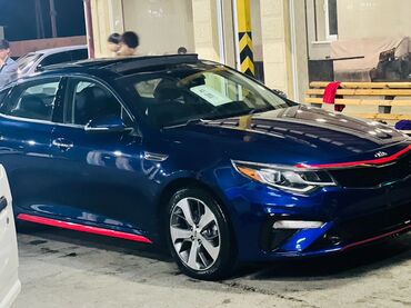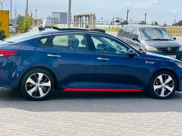 Kia Optima — стильный и технологичный седан бизнес‑класса в насыщенном синем цвете с декоративными красными акцентами.