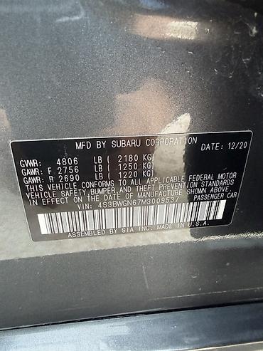 Subaru Legacy, седан, дата выпуска: 12/2020 (VIN: 4S3BWGN67M3009537). Произведён в США.