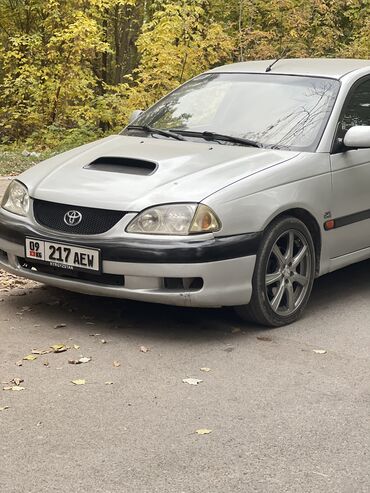 Toyota Avensis, седан, серебристый цвет, кузов T22 (первое поколение, рестайлинг). Кыргызские номера. Основные особенности: - Кузов: 4-дверный седан, заводской спойлер/ветровик капота с надписью A...