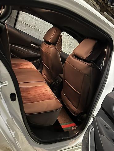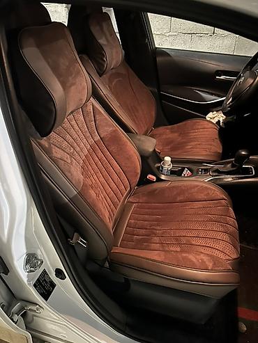 - Салон: тёмный интерьер, установлены мягкие коричневые чехлы из алькантары/эко‑кожи, подушки‑подголовники, центральный подлокотник.