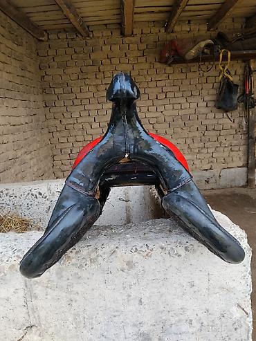 Седельная упряжь для лошади (традиционное азиатское/кочевое седло). Описание: - Жесткое деревянное основание с высокой лукой спереди и сзади для надежной фиксации всадника. - Металлические дуги/ус...