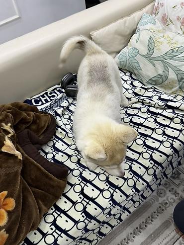 - Окрас: светло-серый/кремовый с белым, маска на морде