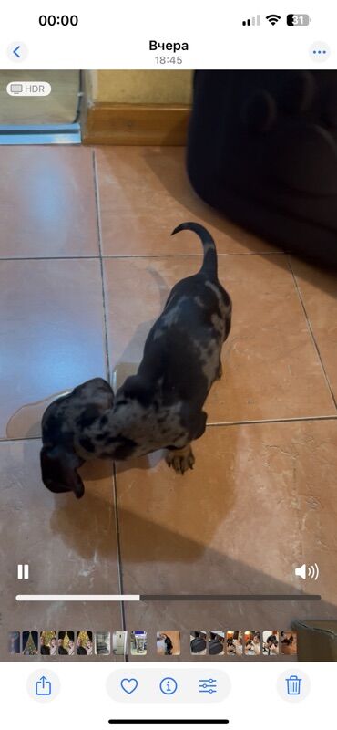 Щенок таксы, окрас мрамор (черно-подпалый с серебристыми пятнами). Короткошёрстный, компактный, с длинным корпусом и густым равномерным мраморным рисунком по спине и шее. Уши мягкие, хвост саблевидный, лапы крепкие. Активный, любопытный, ориентируется на человека, контактный — хорошо идет на руки.