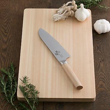 Японский универсальный кухонный нож с высокоточной технологией соединения лезвия и выразительным волновым рисунком кромки — надёжный инструмент для ежедневной готовки и эффектный элемент кухонного набора. Подходит для нарезки овощей, мяса и разделки рыбы. Контраст клинка и рукоять из белого ламинированного дерева создают премиальный внешний вид и удобный, уверенный хват.