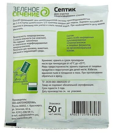 септик Для очистки канализационных стоков. Может применяться в системах с подачей воздуха и без нее. Разлагает мочевину и другие отходы жизнедеятельности, моющие средства, туалетную бумагу, жиры. У...
