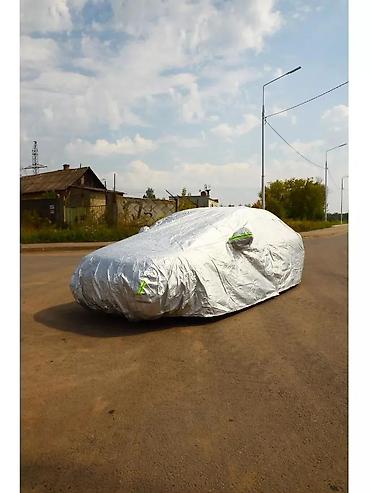 Чехол для автомобиля серебристого цвета, предназначенный для защиты от атмосферных воздействий. Подходит для использования в различных погодных условиях, сохраняя автомобиль в чистоте и защищая от повреждений.