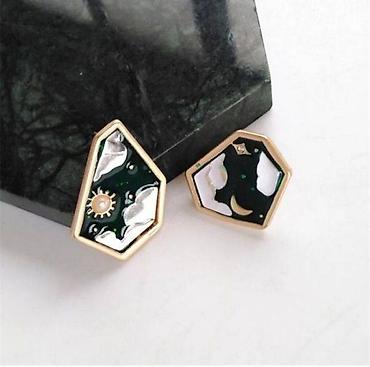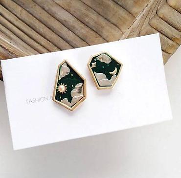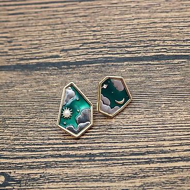 Эти серьги гвоздики — настоящее произведение искусства. Уникальная форма с геометрическими гранями, глубокая эмаль благородного зелёного оттенка и небесные символы — солнце, звезда, луна и облака — создают образ, который привлекает внимание с первого взгляда.