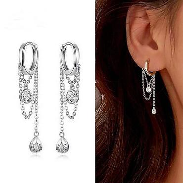 Изящные серьги в виде миниатюрных колец, украшенных подвесными цепочками с сияющими кристаллами круглой и каплевидной формы.