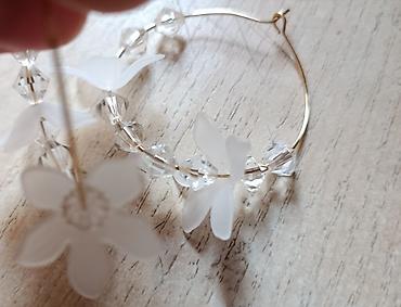 - Декор: матовые белые цветы-лепестки из легкого пластика/акрила, чередуются с ограненными прозрачными бусинами-кристаллами.