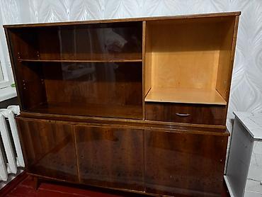 Шкаф с витриной б/у Цвет: махагон морёный под орех Производство: Братислава Состоит из двух шкафов. Верхний шкаф: - Верхняя секция: застекленная витрина с раздвижными дверцами из прозрачного стекл...