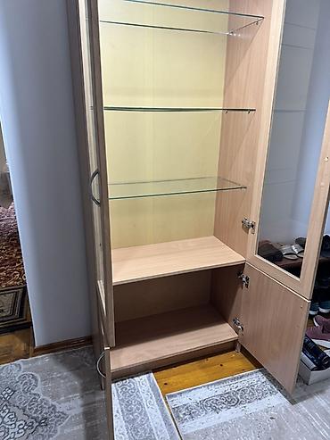Продаются два шкафа под посуду, в хорошем состоянии - Тип: напольная витрина/пенал с одной распашной дверью - Материал корпуса: ЛДСП темного цвета; фасад — зеркало с матовым растительным орнаменто...