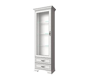 Распашная стеклянная дверца с металлической ручкой предоставляет удобный доступ внутрь. Ящики витрины оснащены шариковыми направляющими, что гарантирует плавное закрывание.