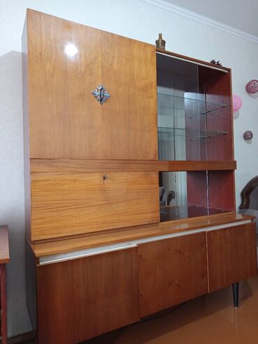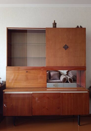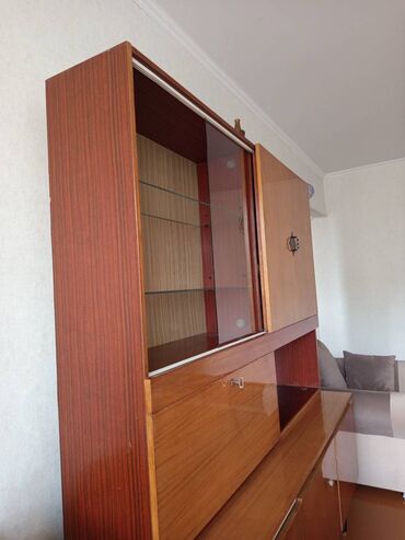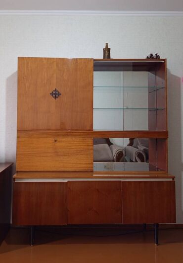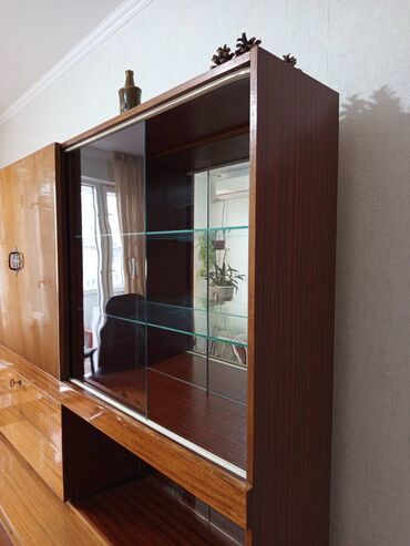 Гостиная стенка/модульный шкаф с витринами и местом под ТВ. В хорошем состоянии. Хочу интерьер поменять. - Компоновка: два высоких шкафа-витрины по бокам, центральный модуль с нишей под телевизор...