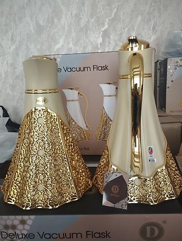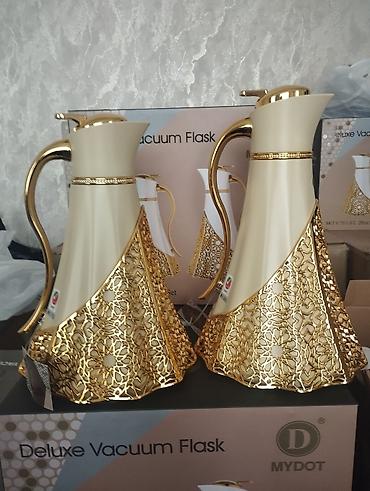 - Вакуумные термос-графины MYDOT (Deluxe Vacuum Flask), набор из 2 штук. Объемы по маркировке: 1,0 л и 0,75 л. Корпус кремового цвета с фигурными ручками, нижняя часть — декоративный золотистый ажур с геометрическим орнаментом. Вакуумная колба для длительного сохранения температуры напитков. Крышка с кнопочным механизмом подачи.